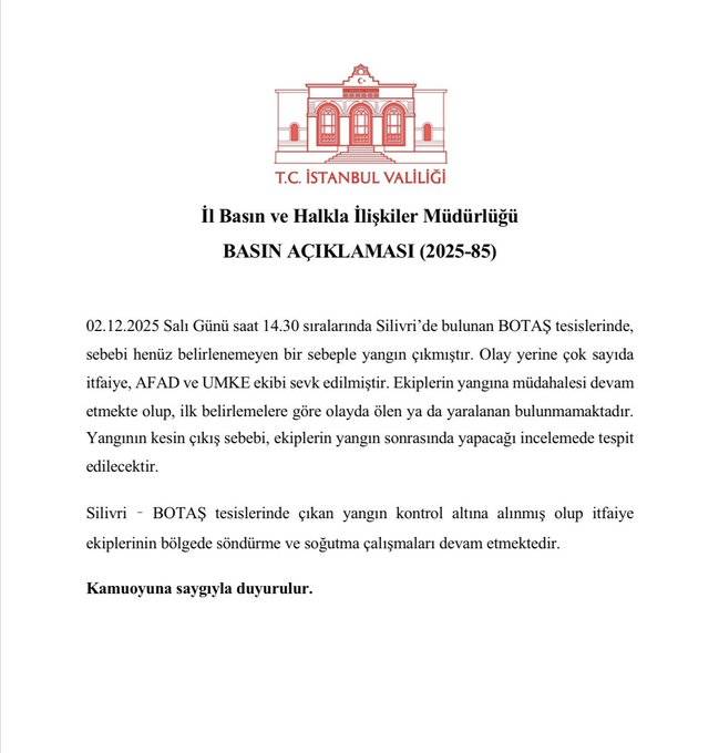 Silivri’deki BOTAŞ tesislerinde meydana gelen yangının tesisin hangi bölümünde başladığına ilişkin yetkililerden henüz net bir açıklama yapılmadı. Buna karşın, sahadaki itfaiye ekiplerinin tesis içinde farklı noktalarda kontrol ve soğutma çalışmalarını sürdürdüğü, bölgedeki durumun yakından takip edildiği ifade ediliyor. Olayın seyri ve yangının yayılım durumu hakkında resmi makamların gün içinde yeni bilgilendirmeler yapması bekleniyor.