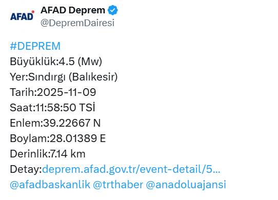 Resmi kayıtlara göre 4,5 büyüklüğündeki sarsıntı, 11.58’de gerçekleşti ve 7,14 km derinlik verisiyle kayda geçti. Balıkesir Sındırgı depremi için yapılan ilk değerlendirmeler, olumsuz bir durum tespit edilmediğine işaret ederken, AFAD koordinasyonunda yürütülen saha taraması ile süreç yakından izleniyor.