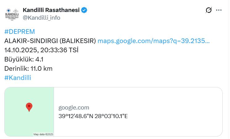 Kandilli Rasathanesi ise depremin büyüklüğünü 4.1, derinliğini 11 km olarak ölçtü. Böylece AFAD ve Kandilli verileri, büyüklük ve derinlik parametrelerinde birbirine yakın sonuçlar ortaya koydu.