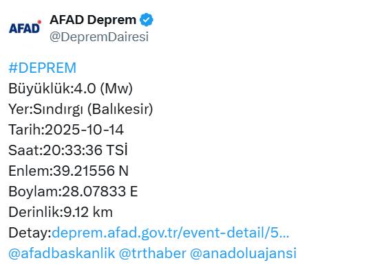 Afet ve Acil Durum Yönetimi Başkanlığının (AFAD) internet sitesinde yer alan bilgiye göre Balıkesir’in Sındırgı ilçesinde 4.0 büyüklüğünde deprem meydana geldi. Saat 20.33’te gerçekleşen sarsıntının 9.12 kilometre derinlikte kaydedildiği bildirildi. Deprem sonrası ilk belirlemelere göre herhangi bir olumsuzluk tespit edilmedi.