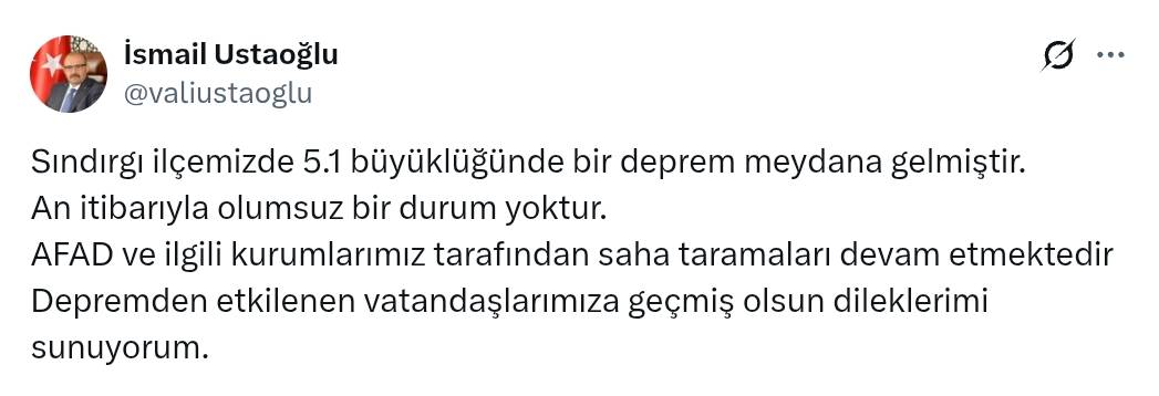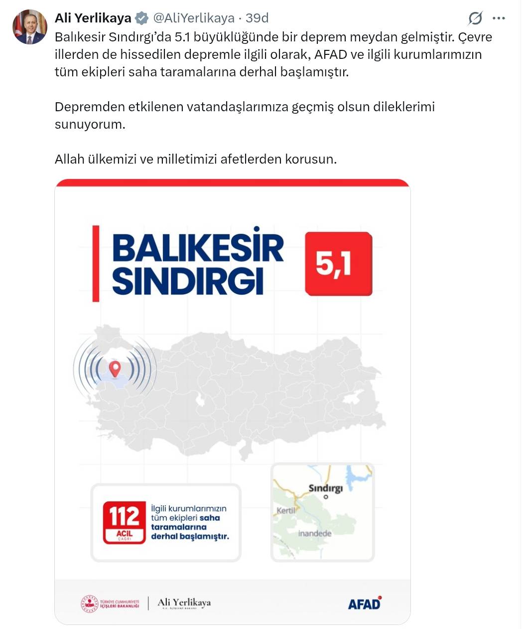 “Sındırgı ilçemizde 5.1 büyüklüğünde bir deprem meydana gelmiştir. An itibarıyla olumsuz bir durum yoktur. AFAD ve ilgili kurumlarımız tarafından saha taramaları devam etmektedir. Depremden etkilenen vatandaşlarımıza geçmiş olsun dileklerimi sunuyorum.”