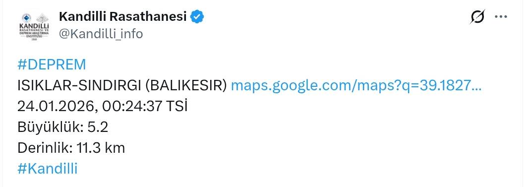 Balıkesir’in Sındırgı ilçesinde 00:24’te meydana gelen deprem, Kandilli Rasathanesi tarafından 5.2 büyüklüğünde duyurulurken, sarsıntının İstanbul’dan da hissedildiği bildirildi. Kandilli verilerine göre ilk depremin ardından 4 dakika arayla bu kez 3.6 bü