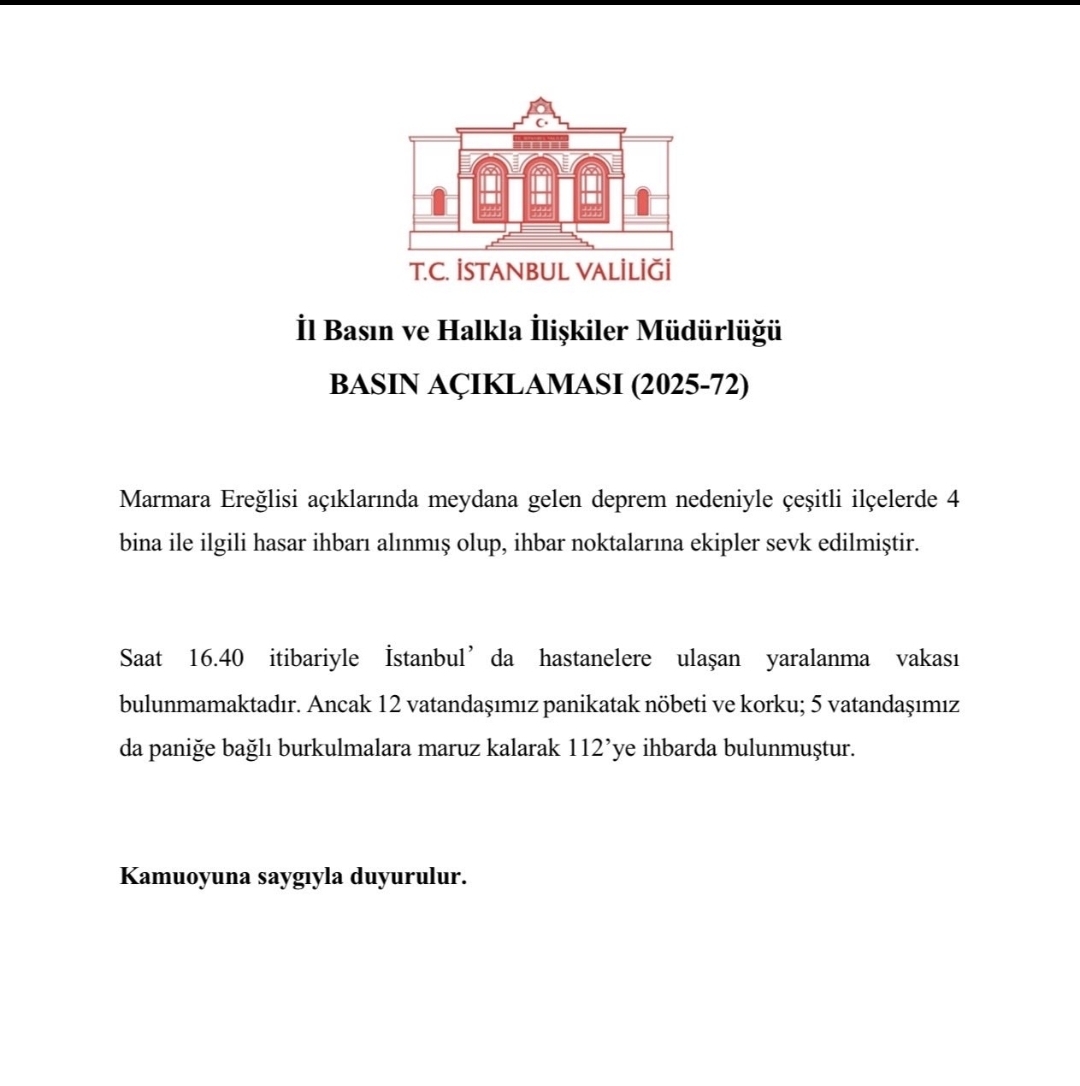 Marmara Ereğlisi açıklarında meydana gelen deprem, İstanbul genelinde de hissedildi. İstanbul Valiliği, olayın ardından yaptığı açıklamada çeşitli ilçelerde 4 bina ile ilgili hasar ihbarı alındığını, ihbar noktalarına ekiplerin sevk edildiğini bildirdi. Deprem sonrası kentte oluşan endişe ve belirsizlik ortamında, valilikten gelen bu ilk bilgilendirme, sahadaki müdahale ve kontrol adımlarının hızla devreye alındığını ortaya koydu.