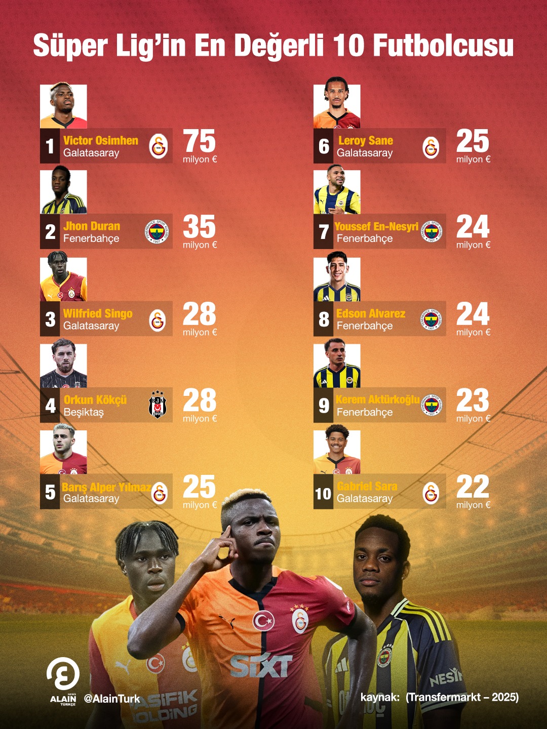 Transfermarkt, Süper Lig oyuncularının piyasa değerlerini güncelledi. Galatasaray zirvede yer alırken, işte ligin en değerli 20 futbolcusu ve yeni piyasa değerleri.