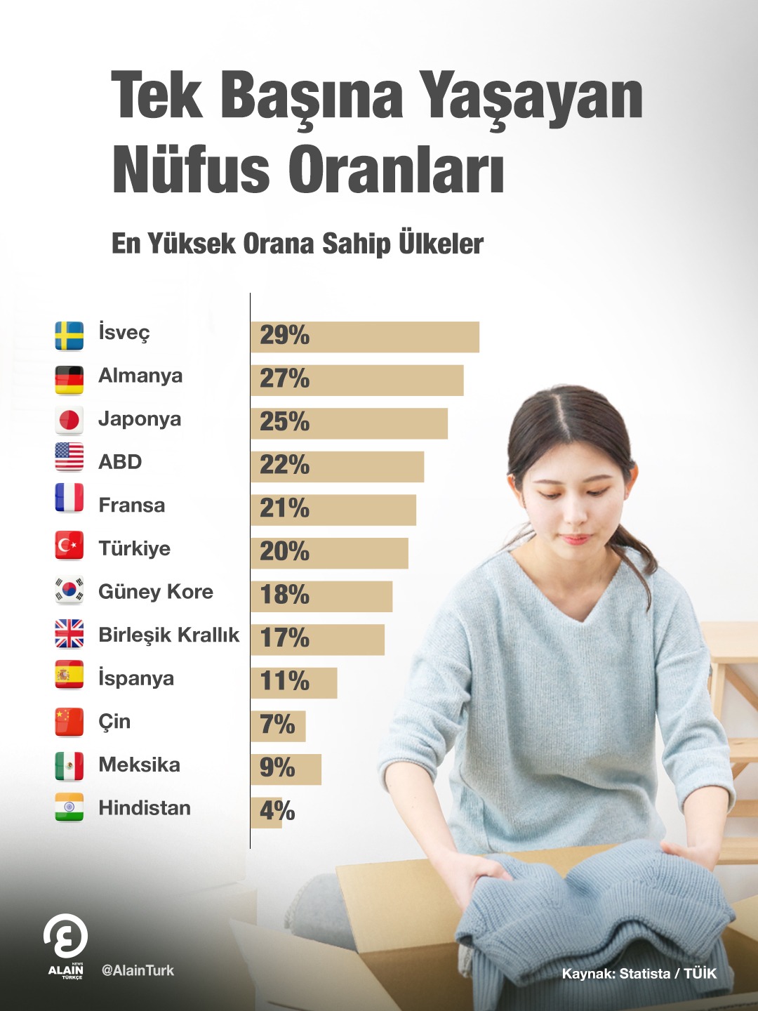 Dünya genelinde tek başına yaşayan bireylerin oranı her geçen yıl artarken, ülkeler arasındaki farklar dikkat çekiyor. İşte tek başına yaşama oranlarının en yüksek olduğu ülkeler ve Türkiye’nin küresel sıralamadaki yeri: