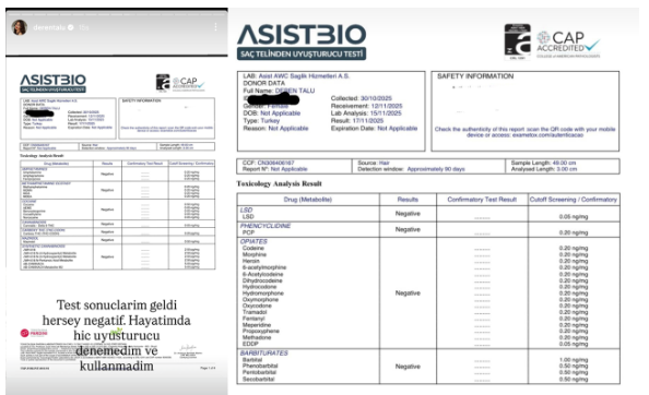 Talu, yeni test sonrası paylaştığı mesajında “Test sonuçlarım geldi, her şey negatif. Hayatımda hiç uyuşturucu denemedim ve kullanmadım” ifadelerini kullandı. Soruşturma kapsamında resmi incelemeler sürüyor.