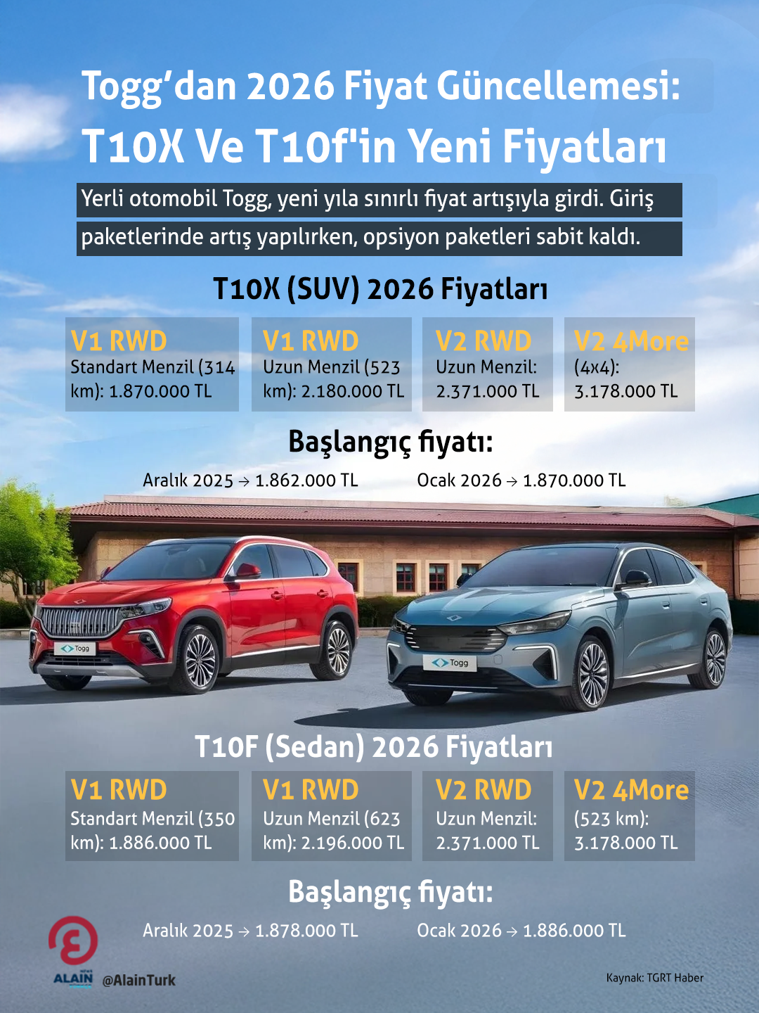 Yerli otomobil Togg, yeni yıla sınırlı fiyat artışıyla girdi. Giriş paketlerinde artış yapılırken, opsiyon paketleri sabit kaldı.