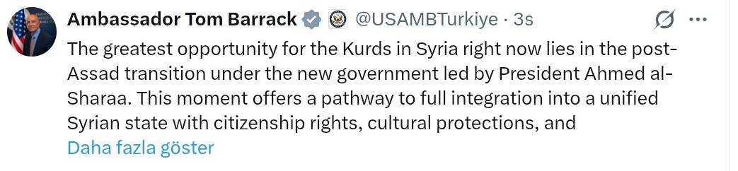 Sosyal medya hesabından paylaşım yapan Tom Barrack, “SDG’nin sahadaki birincil anti-DEAŞ gücü olma yönündeki asıl amacı büyük ölçüde sona ermiştir” ifadesini kullandı. Barrack, Suriye’deki Kürtler için “şu anki en büyük fırsatın”, Devlet Başkanı Ahmed el-Şara liderliğindeki yeni hükümet döneminde, Esed sonrası geçiş sürecinde bulunduğunu belirterek, bu dönemin “vatandaşlık hakları, kültürel korumalar ve siyasi katılım ile birleşik bir Suriye devletine tam entegrasyon için bir yol sunduğunu” dile getirdi.