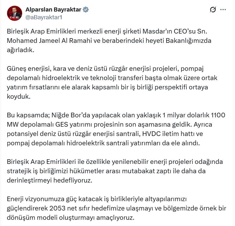 Bayraktar, Masdar CEO’su Mohamed Jameel Al Ramahi ile yapılan görüşmede BAE ile yenilenebilir enerji projeleri odağında kapsamlı bir işbirliği perspektifi ortaya koyduklarını kaydetti. Güneş enerjisinden rüzgâra, pompaj depolamalı hidroelektrikten teknoloji transferine uzanan başlıklarda ortak yatırım fırsatlarının detaylı şekilde masaya yatırıldığına dikkat çekildi.