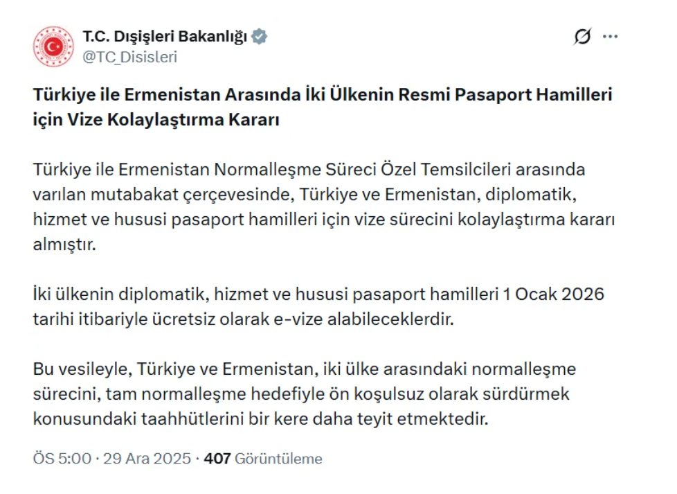 "Türkiye ile Ermenistan Arasında İki Ülkenin Resmi Pasaport Hamilleri için Vize Kolaylaştırma Kararı Türkiye ile Ermenistan Normalleşme Süreci Özel Temsilcileri arasında varılan mutabakat çerçevesinde, Türkiye ve Ermenistan, diplomatik, hizmet ve hususi pasaport hamilleri için vize sürecini kolaylaştırma kararı almıştır. İki ülkenin diplomatik, hizmet ve hususi pasaport hamilleri 1 Ocak 2026 tarihi itibariyle ücretsiz olarak e-vize alabileceklerdir. Bu vesileyle, Türkiye ve Ermenistan, iki ülke arasındaki normalleşme sürecini, tam normalleşme hedefiyle ön koşulsuz olarak sürdürmek konusundaki taahhütlerini bir kere daha teyit etmektedir."