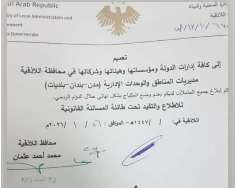 Lazkiye ilindeki tüm devlet idarelerine, kurumlarına, heyetlerine ve bağlı kuruluşlarına, bölge müdürlüklerine ve idari birimlere (şehirler – beldeler – belediyeler)