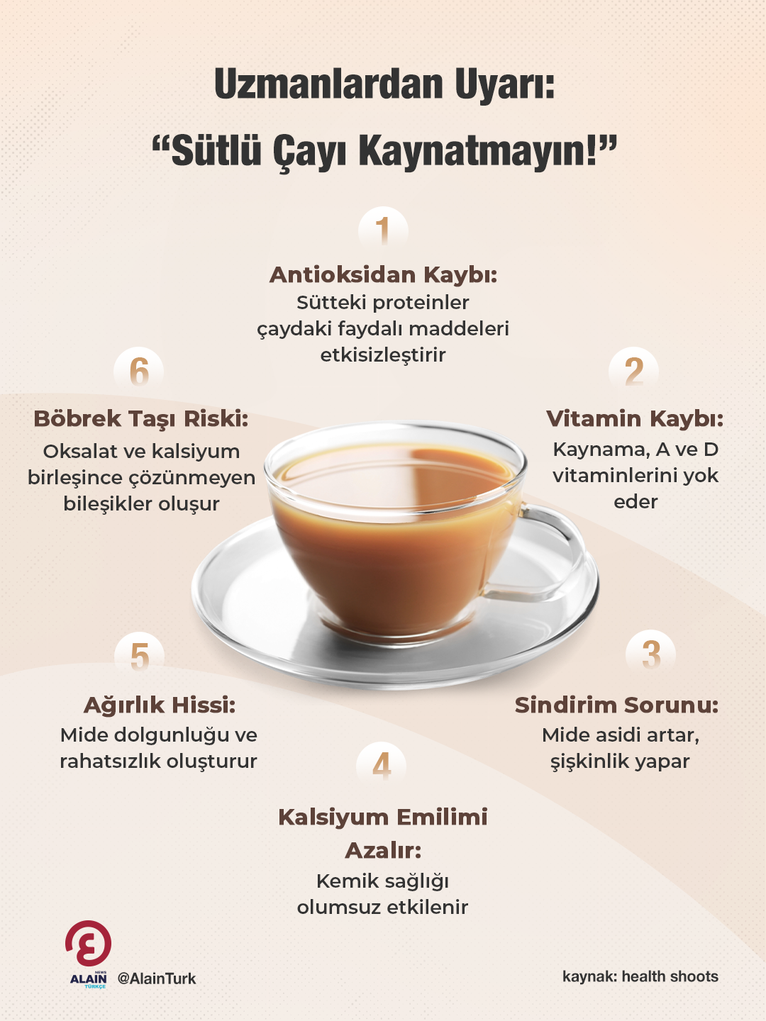 Uzmanlar, sütle karıştırılan çayın kaynatılmasının içeriğindeki faydalı bileşenleri yok ettiğini ve sağlık açısından risk oluşturabileceğini belirtiyor.