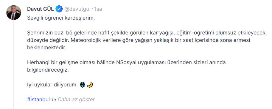 İstanbul Valisi Davut Gül, kentte etkili olan kar yağışının eğitim ve öğretimi olumsuz etkileyecek düzeyde olmadığını bildirdi. Vali Gül, sosyal medya hesabından yaptığı paylaşımda, şehrin bazı bölgelerinde hafif şekilde görülen kar yağışının eğitim-öğretimi olumsuz etkileyecek düzeyde olmadığını, meteorolojik verilere göre yağışın yaklaşık bir saat içerisinde sona ermesinin beklendiğini ve herhangi bir gelişme olması halinde sosyal medya üzerinden anında bilgilendirme yapılacağını ifade etti.
