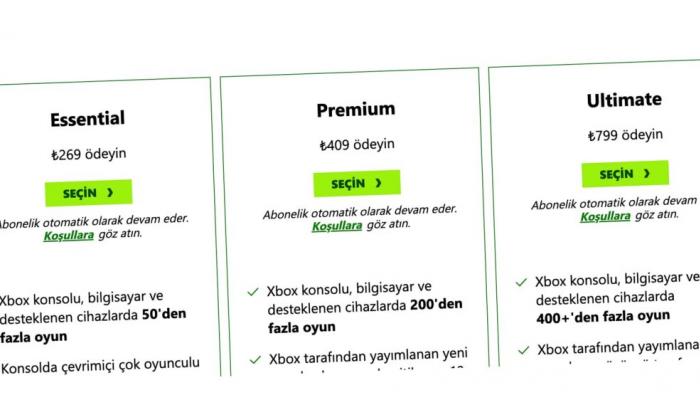 Essential, Premium ve Ultimate olarak yeniden yapılandırılan Xbox Game Pass paketlerinde Türkiye fiyatları 269 TL ile 799 TL arasında değişiyor.