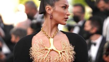 74. Cannes Film Festivali'ne katılan ünlü manken Bella Hadid'in kırmızı halıda taktığı Schiaparelli imzalı "altın akciğer" temalı kolyesi moda dünyasının gündemine oturdu.